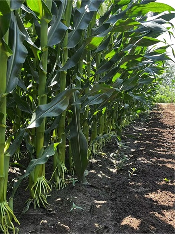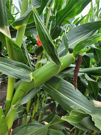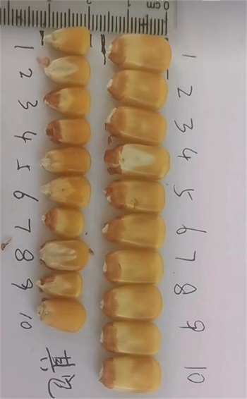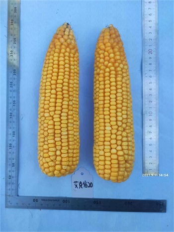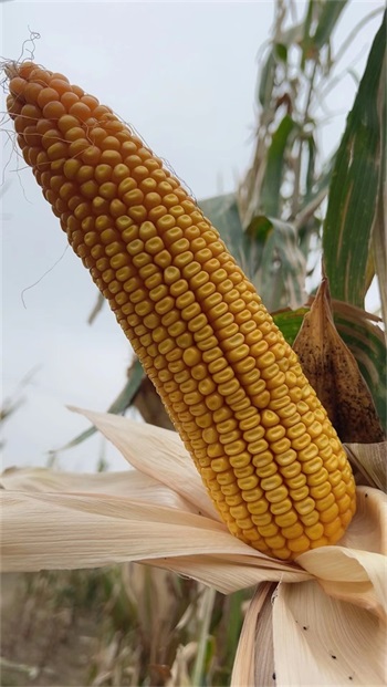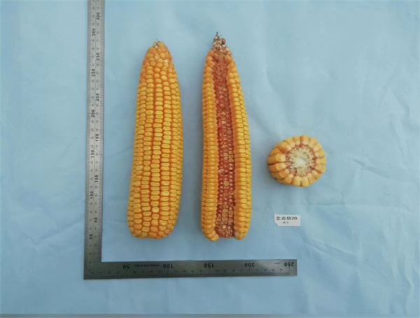中晚熟品种,出苗至成熟127天,与对照先玉335熟期相同。幼苗叶鞘紫色,叶缘浅紫色,花药绿色,颖壳绿色。株型半紧凑,株高293厘米,穗位高113厘米,成株叶片数21片。果穗锥型,穗长21.2厘米,行数16~18行穗轴红色,籽粒黄色、偏马齿型,百粒重41.6克。接种鉴定,中抗大斑病、中抗茎腐病,感灰斑病,感丝黑穗病,感穗腐病。籽粒容重765克/升,粗蛋白含量10.02%,粗脂肪含量4.16%,粗淀粉含量72.66%,赖氨酸含量0.30%。